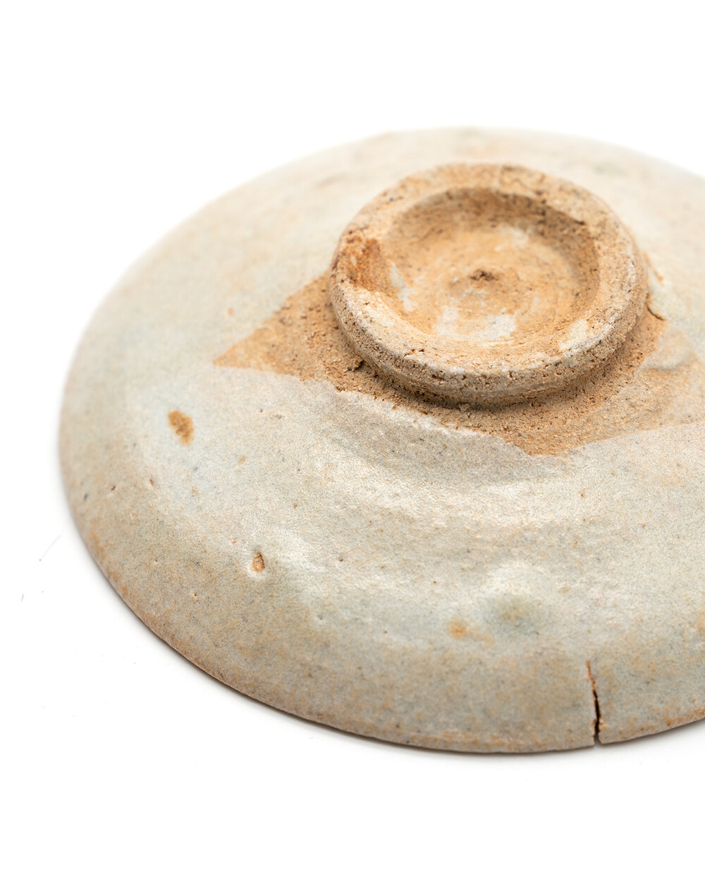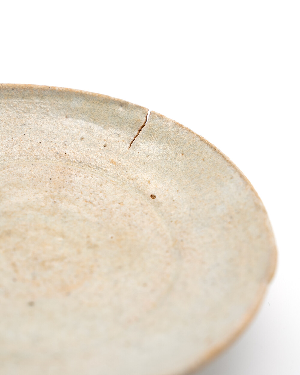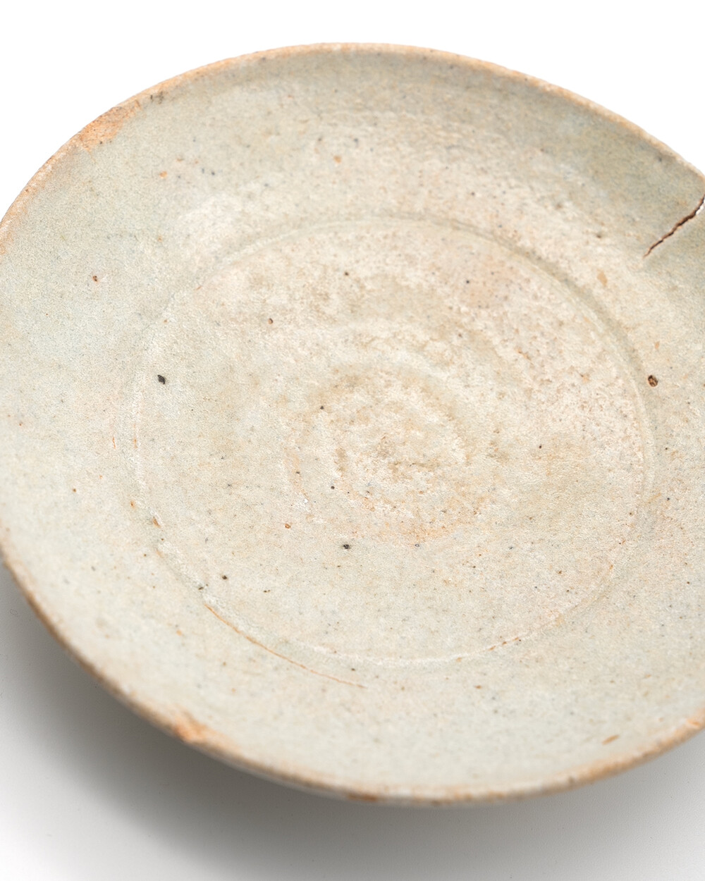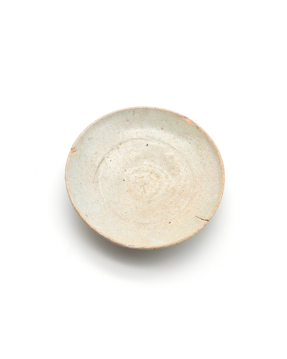 조선 전기(15세기 후반~16세기 초) 제작된 분청계 초기 백자 접시입니다. 얇게 발린 담청색 유약과 자연스러운 유약 흐름, 그리고 굽 주변에 남은 가마 받침 흔적이 노천 야외 가마 소성의 특징을 고스란히 보여줍니다. 림은 얇고 넓게 퍼지며 중앙부는 완만하게 오목한 형태를 이루어 고요한 조형미와 안정된 비례를 드러냅니다. 복원이나 보수 없이 자연 상태를 유지하고 있으며 담백한 아름다움 속에 조선 초기 도자기의 절제된 미감을 온전히 담아낸 접시입니다.