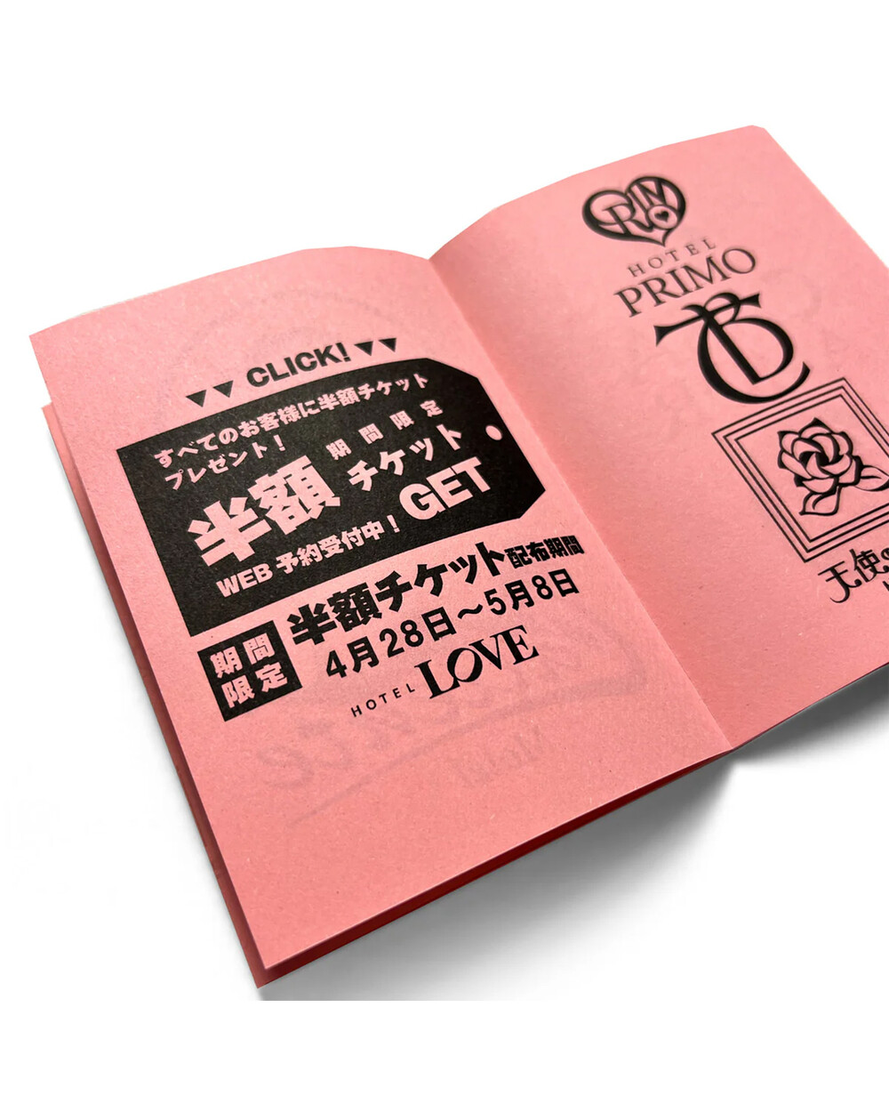 +Black ink on pink 80 g/m² EOS paper with glue binding