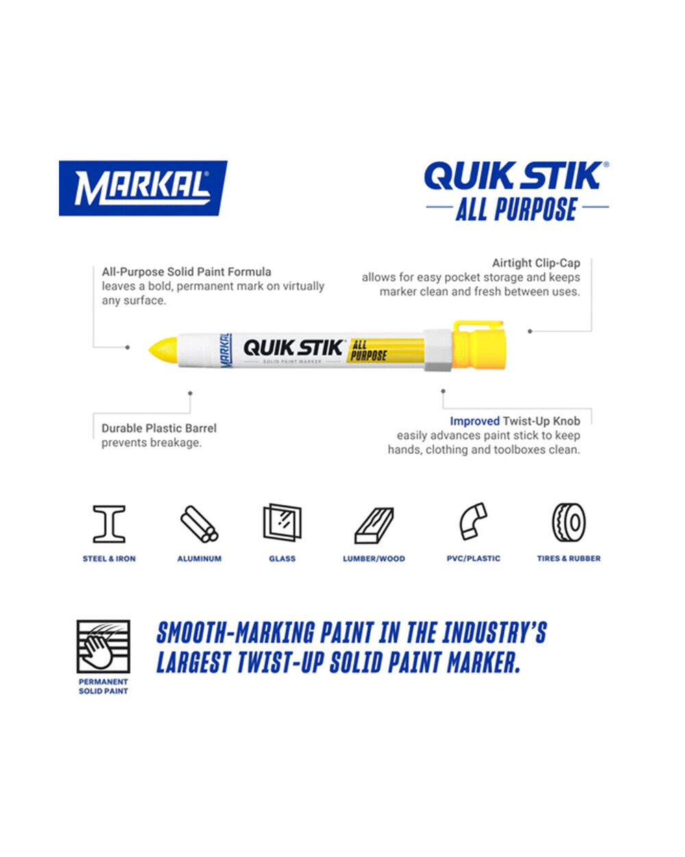 다목적 퀵페인트스틱은 고체형 산업용 페인트 마커로 5~7분 만에 빠르게 건조되며 철판, 나무, 플라스틱, 콘크리트, 유리, 종이 등 대부분의 산업재 표면에 선명하고 영구적인 마킹을 남깁니다.