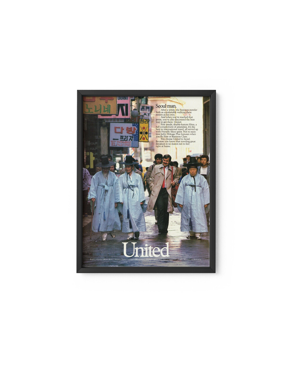 한국 골목 풍경과 갓·도포 차림의 노인들 사이를 트렌치코트를 걸친 출장자가 거니는 한 컷, 그리고 헤드라인 'Seoul man'—먼 길을 날아왔어도 현지에서 편안함을 느끼게 한다는 Fly the Friendly Skies 정서를 그대로 담은 유나이티드항공의 국제선 캠페인 지면입니다. 본문 카피는 기내식·더블 피처 영화·마일리지 보너스와 같은 편의, 퍼스트·비즈니스 클래스 서비스, 전세계 네트워크를 나열하며 “먼 여행이라도 집처럼 느끼게 한다”는 메시지로 마무리됩니다. 광고사적으론 80년대 글로벌 비즈니스 트래블 붐 속에서 목적지의 로컬 장면 + 서비스 리스트업 카피라는 공식을 정교하게 보여주는 사례입니다.