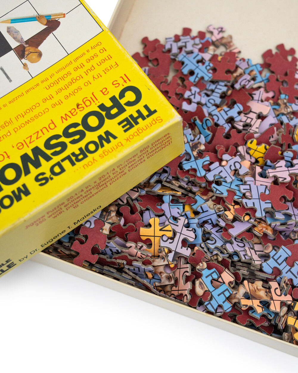 70년대 제작된 스프링복의 이 놀라운 퍼즐은 고전 퍼즐의 대명사인 크로스워드-십자말풀이 와 직소퍼즐을 결합한 제품입니다. 뉴욕타임즈의 크로스워드를 기고했던 유진 T 말레스카가 제작했으며 특이하고 놀라운 점은 직소 퍼즐외에도 크로스워드 시트 10장이 포함되어 있어 콤보 플레이가 가능하다는 것입니다. 크로스워드광이라면 250개 이상의 퀴즈가 숨겨져있는 이 보물상자를 놓치지 않을 것입니다!
