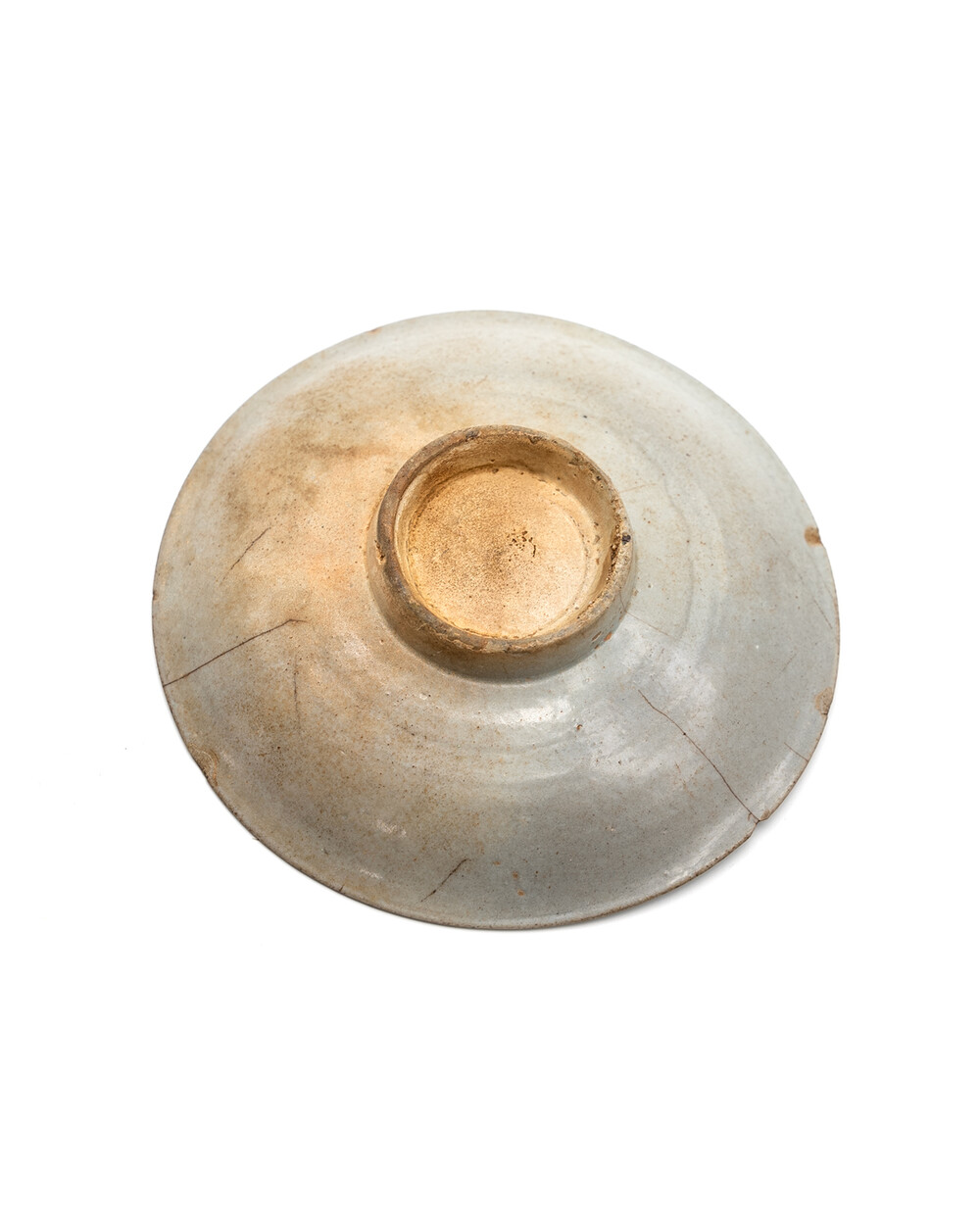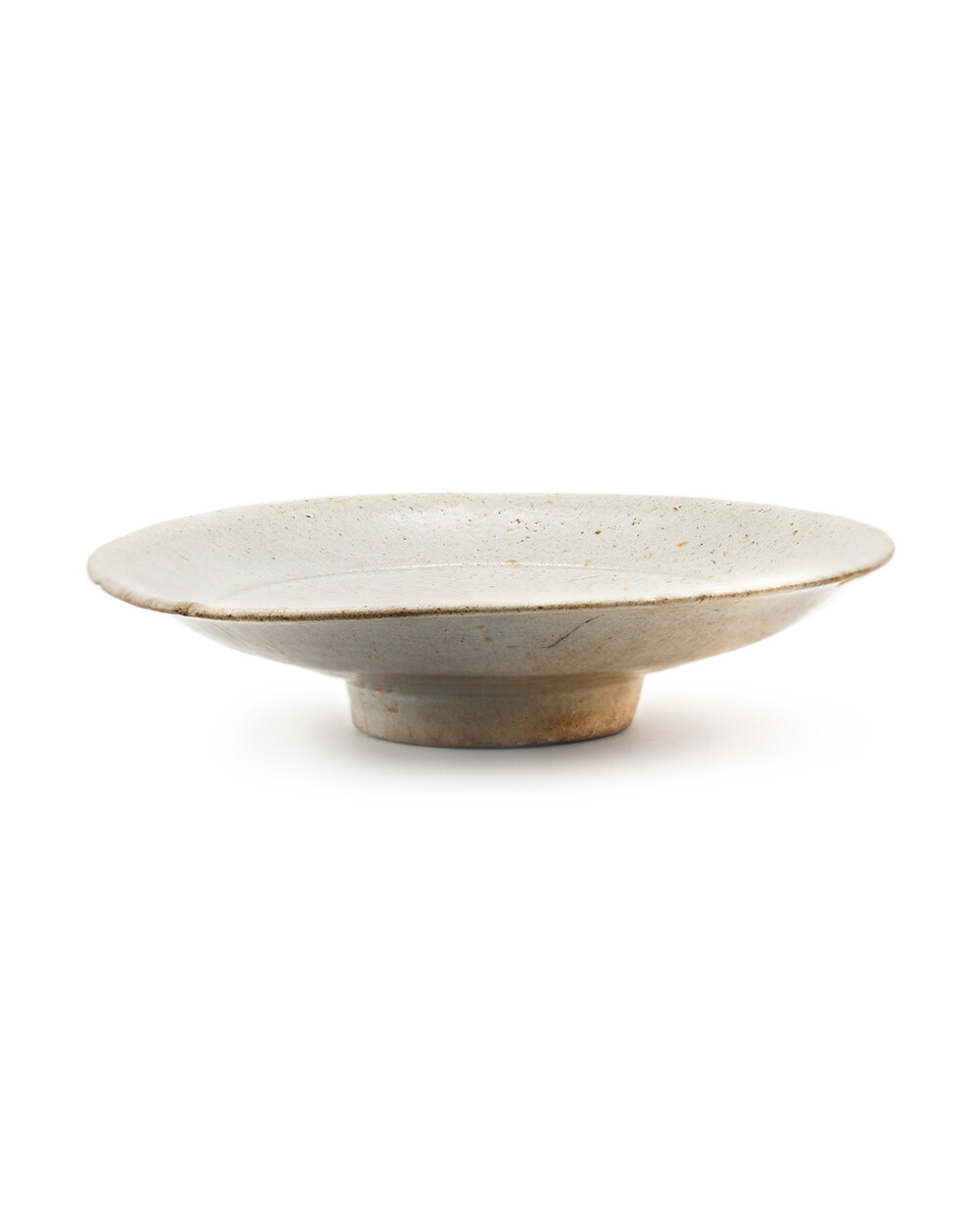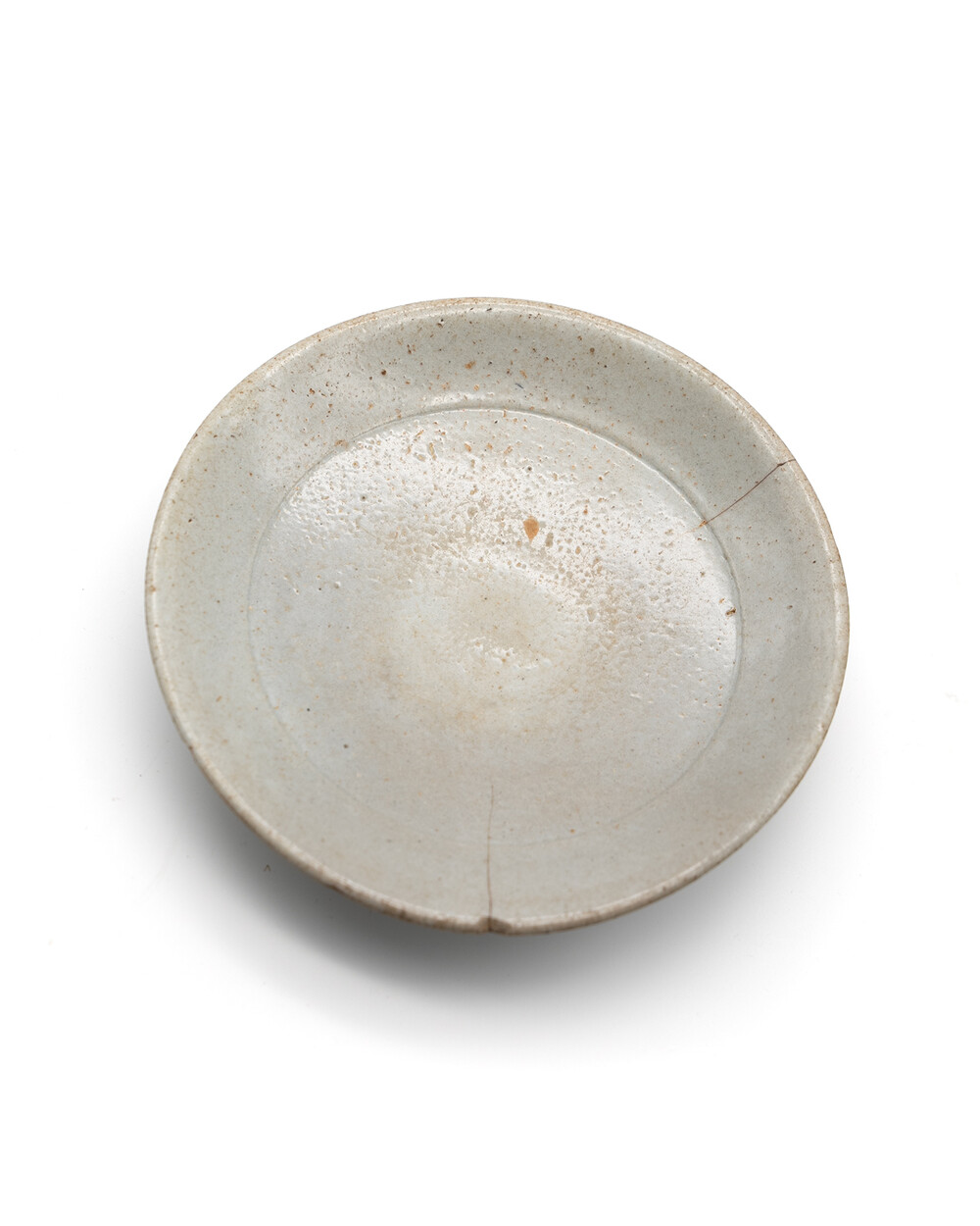 조선 전기(15세기 후반~16세기 초) 제작된 무문 분청계 초기 백자 접시입니다. 얇게 담금 시유된 담청색 유약이 고르게 퍼져 있으며 자연소성 중 생긴 유약 흐름과 기포 흔적이 고스란히 살아 있습니다. 림은 얇고 수평으로 퍼지고 중앙부는 완만하게 오목한 구조를 이루어 조선 초기 특유의 절제된 형태미를 보여줍니다. 굽은 낮고 넓게 깎였으며 바닥에는 가마 받침 흔적과 소성 얼룩이 선명히 남아 있습니다.