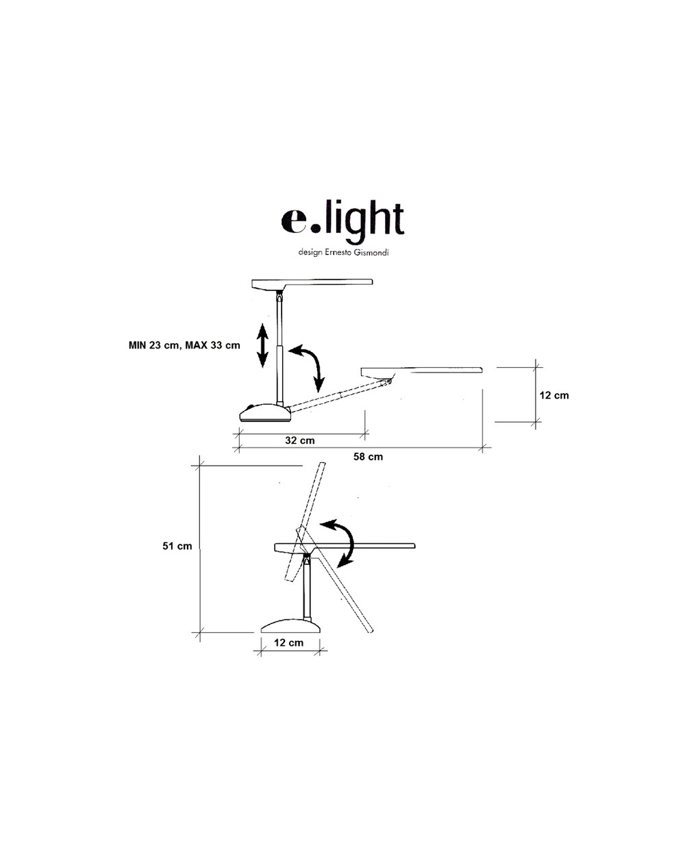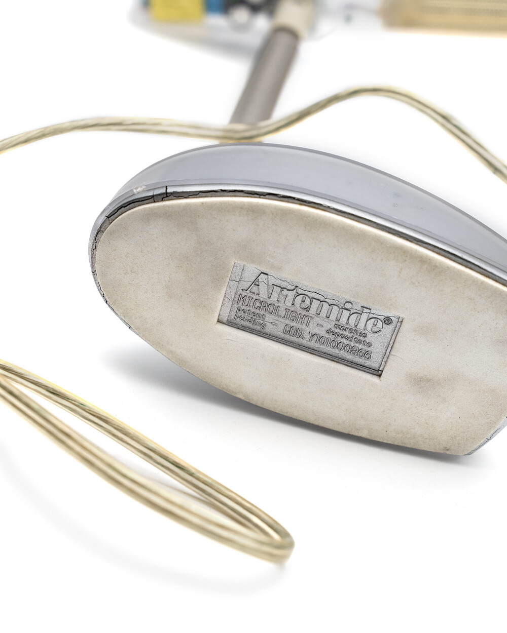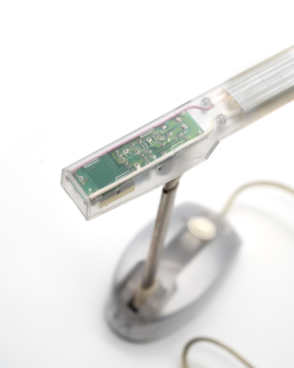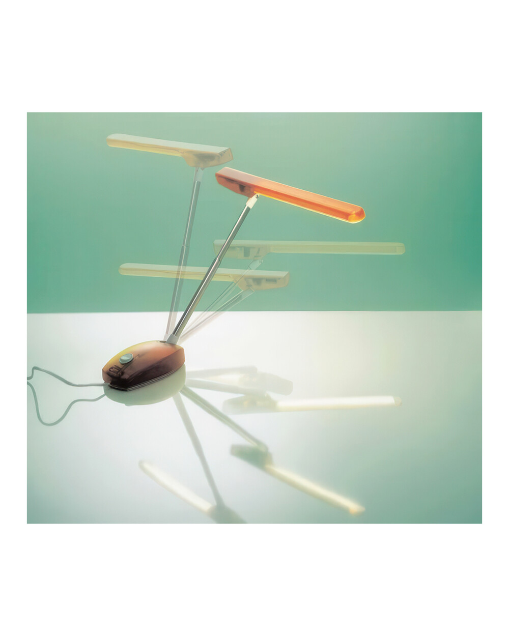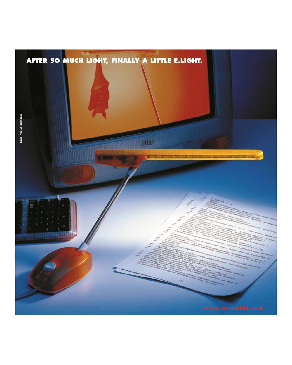 1990년대 아르떼미데를 위해, 브랜드의 공동 설립자이자 천재적인 디자이너 에르네스토 지스몬디(Ernesto Gismondi)가 직접 디자인한 'E-Light' 테이블 램프입니다. 이 램프의 주요 아이디어는 에너지 효율이 매우 높으면서도 키보드, 메모장 등 작은 작업 영역을 밝히기에 충분한 밝기를 제공하는 것으로써 당시 새롭게 도래한 개인용 컴퓨터(PC) 시대의 라이프스타일을 반영하고 있습니다. 특히 유선형의 간결한 실루엣, 플라스틱 소재 활용, 슬림하게 뻗은 관절형 암(Arm) 구조는 1990년대 후반 혁신적인 디자인으로 세상을 뒤흔들었던 애플의 1세대 '아이맥(iMac)'의 영향을 받은 것으로 당시의 디자인 트렌드를 그대로 보여줍니다.