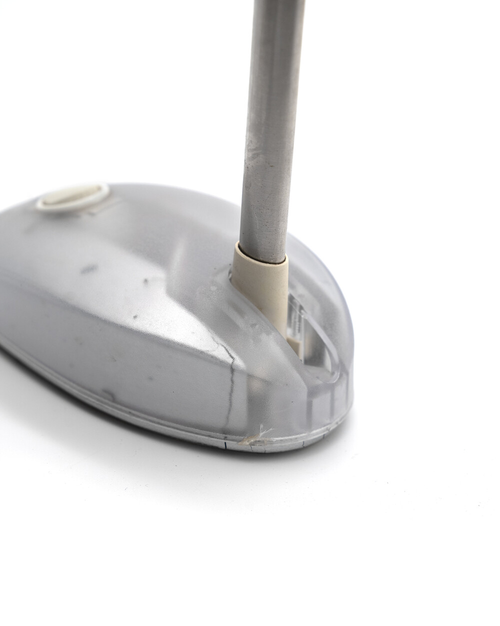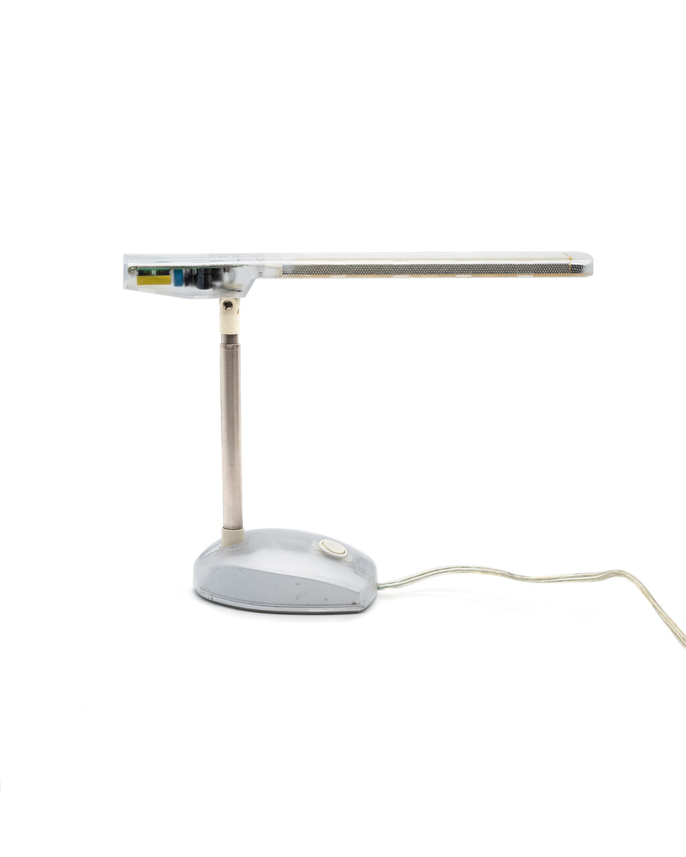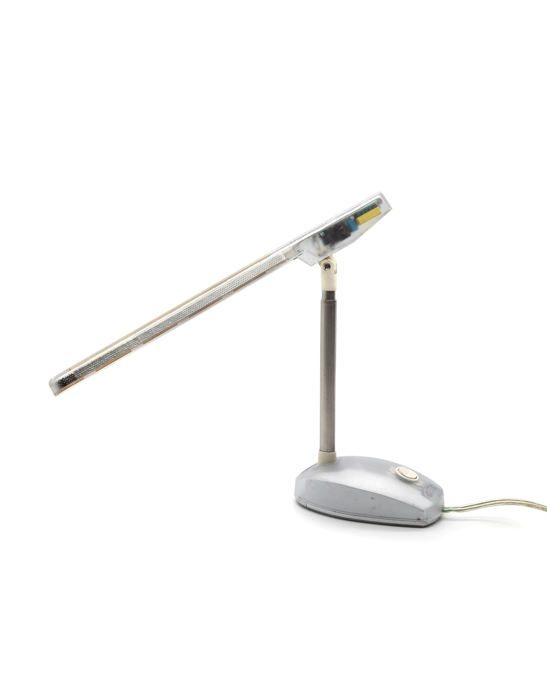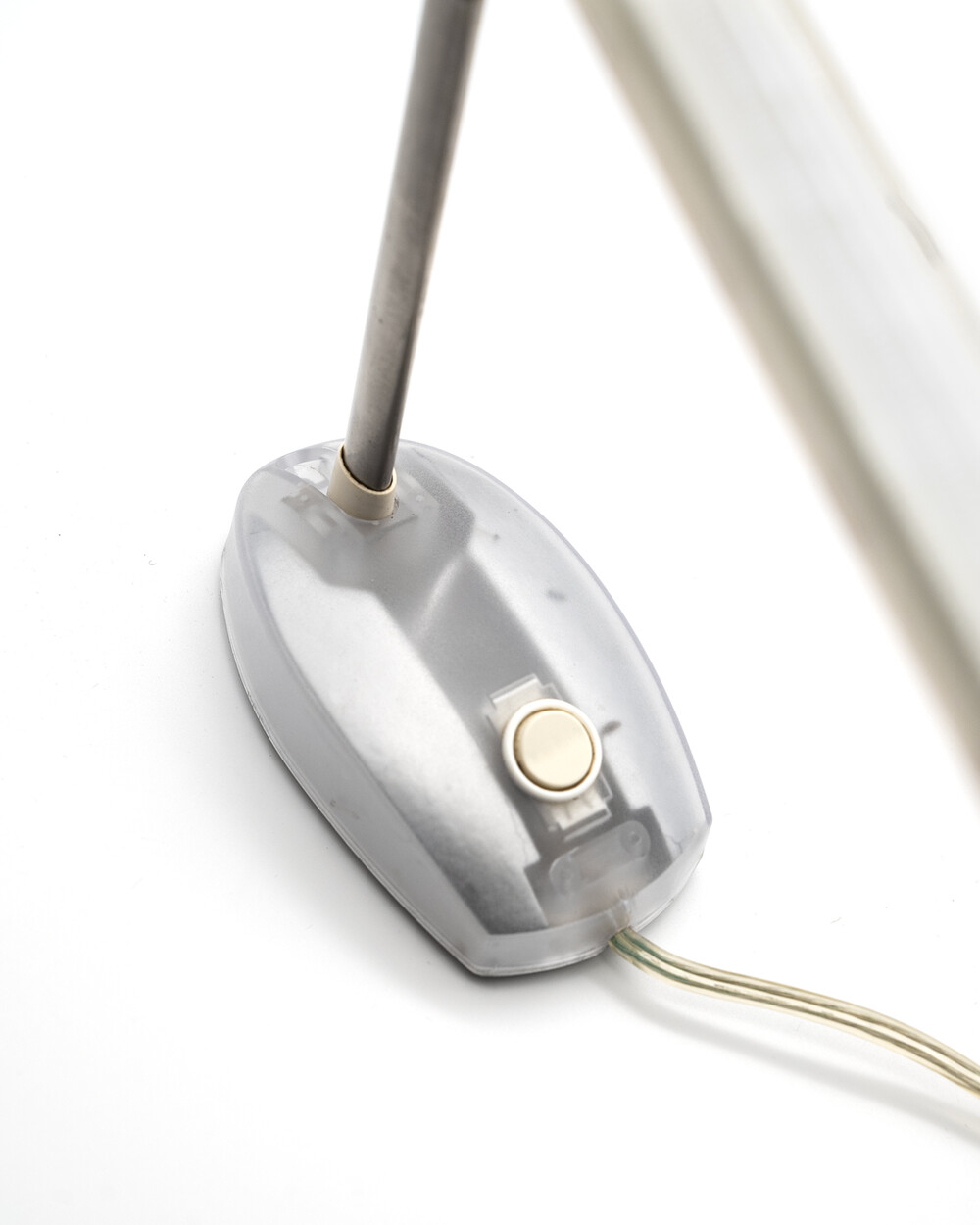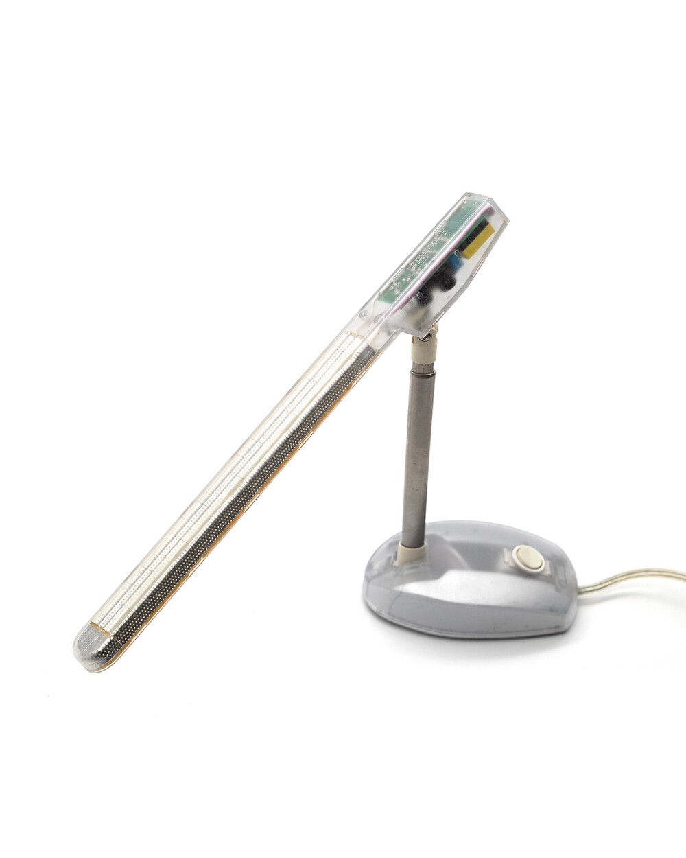 1990년대 아르떼미데를 위해, 브랜드의 공동 설립자이자 천재적인 디자이너 에르네스토 지스몬디(Ernesto Gismondi)가 직접 디자인한 'E-Light' 테이블 램프입니다. 이 램프의 주요 아이디어는 에너지 효율이 매우 높으면서도 키보드, 메모장 등 작은 작업 영역을 밝히기에 충분한 밝기를 제공하는 것으로써 당시 새롭게 도래한 개인용 컴퓨터(PC) 시대의 라이프스타일을 반영하고 있습니다. 특히 유선형의 간결한 실루엣, 플라스틱 소재 활용, 슬림하게 뻗은 관절형 암(Arm) 구조는 1990년대 후반 혁신적인 디자인으로 세상을 뒤흔들었던 애플의 1세대 '아이맥(iMac)'의 영향을 받은 것으로 당시의 디자인 트렌드를 그대로 보여줍니다.
