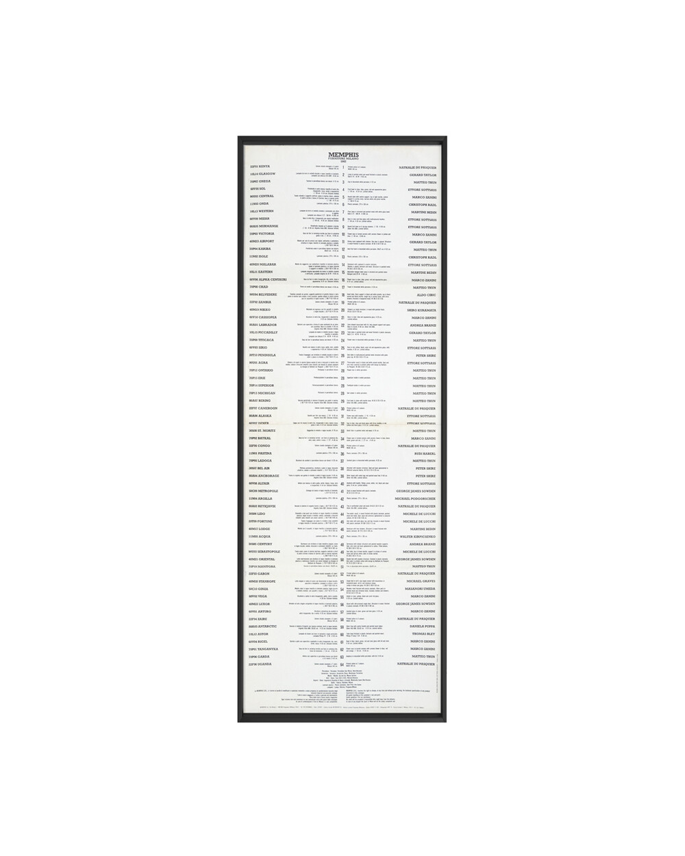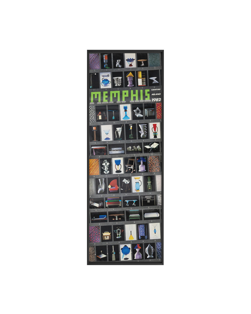 에토레 소트사스의 주도하에 멤피스 디자인이라는 새로운 물결을 일으켰던 멤피스 밀라노는 1980-1988년까지 매년 새로운 컬렉션을 선보이며 현재까지 영향을 준 전위적인 그룹입니다. 멤피스 밀라노에서 발행된 이 포스터는 마르티네 베딘, 마테오 툰, 미켈레 데 루치, 에토레 소트사스 등 멤피스 그룹의 대표 디자이너 64개의 작품들이 실려있으며 각 그림에는 제목, 연도, 디자이너, 기술적 특성 및 스펙이 포함된 자세한 캡션이 함께 제공됩니다.