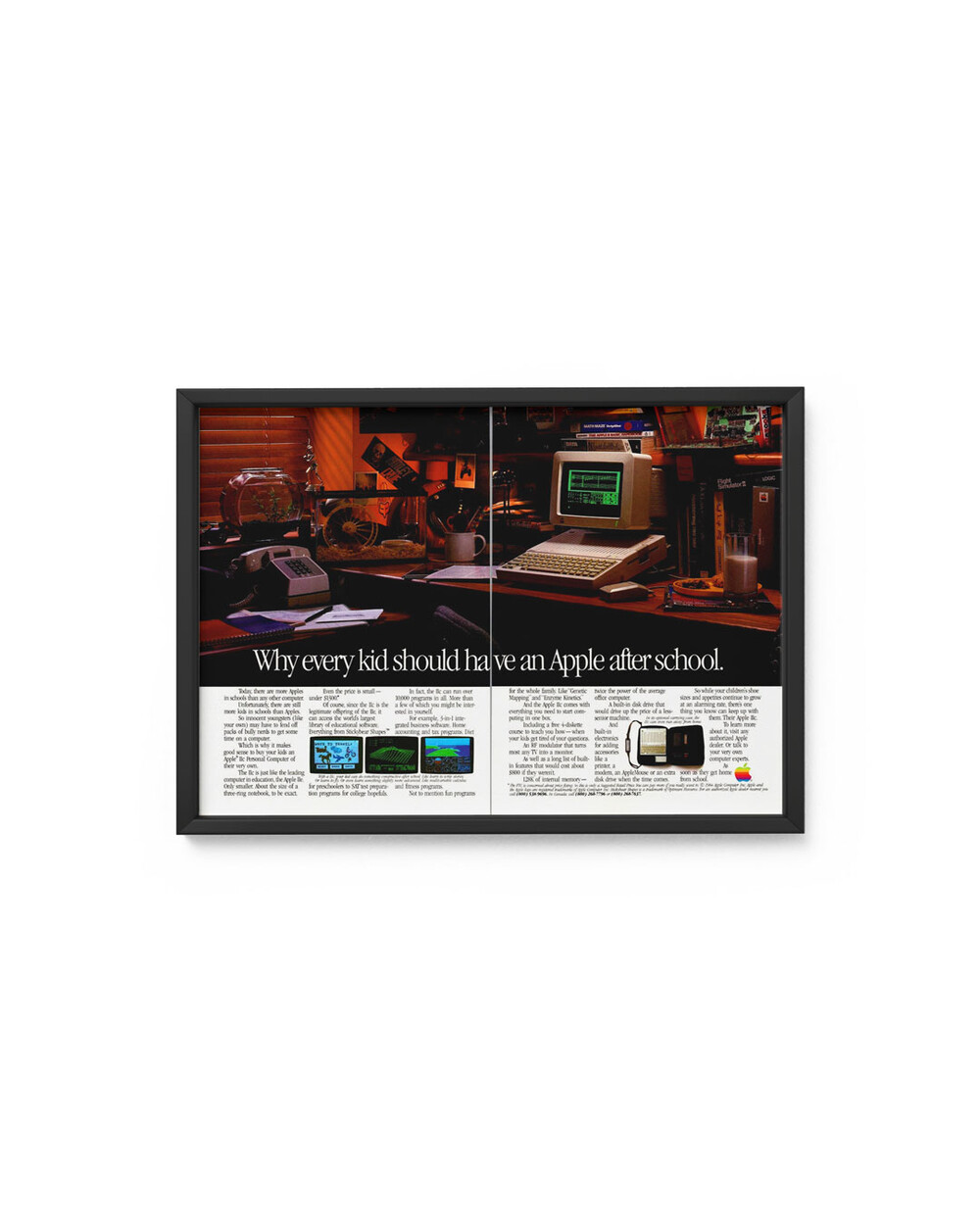방과 후 아이의 책상 한가운데 놓인 Apple IIc와 초록색 모니터 화면, 옆엔 우유와 쿠키, 햄스터 케이지, 과제용 참고서와 게임 카트리지들… 80년대 미국 가정의 ‘애프터 스쿨’ 풍경을 그대로 담은 교육용 캠페인으로서 맥 이전의 애플이 ‘가정·교육 시장’을 어떻게 사로잡았는지 보여 주는 대표적인 광고입니다. 헤드라인 “Why every kid should have an Apple after school.” 아래 바디 카피는 “학교에서도 가장 많이 쓰이는 컴퓨터”로서 IIc를 소개하며, 내장 플로피 디스크 드라이브, TV를 모니터로 바꿔 주는 RF 모듈레이터, 프린터·모뎀·AppleMouse·추가 디스크 드라이브까지 확장되는 생태계를 강조합니다. “작은 노트(three-ring notebook)만 한 크기”라는 문구처럼 콤팩트한 섀시와 수만 종의 교육/엔터테인먼트 소프트웨어 호환성까지 내세워, ‘신발은 금방 작아지지만 컴퓨터는 함께 자란다’는 메시지를 설득력 있게 전합니다.