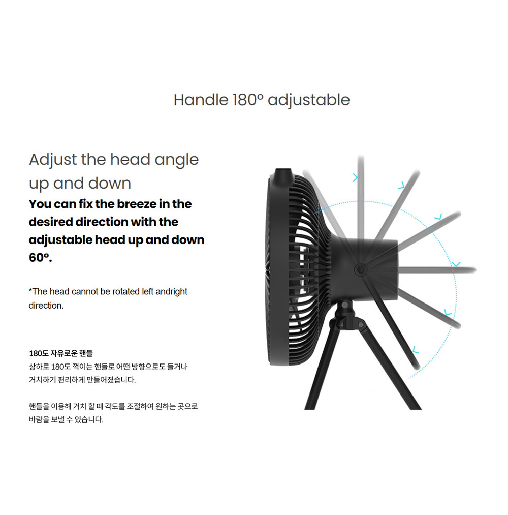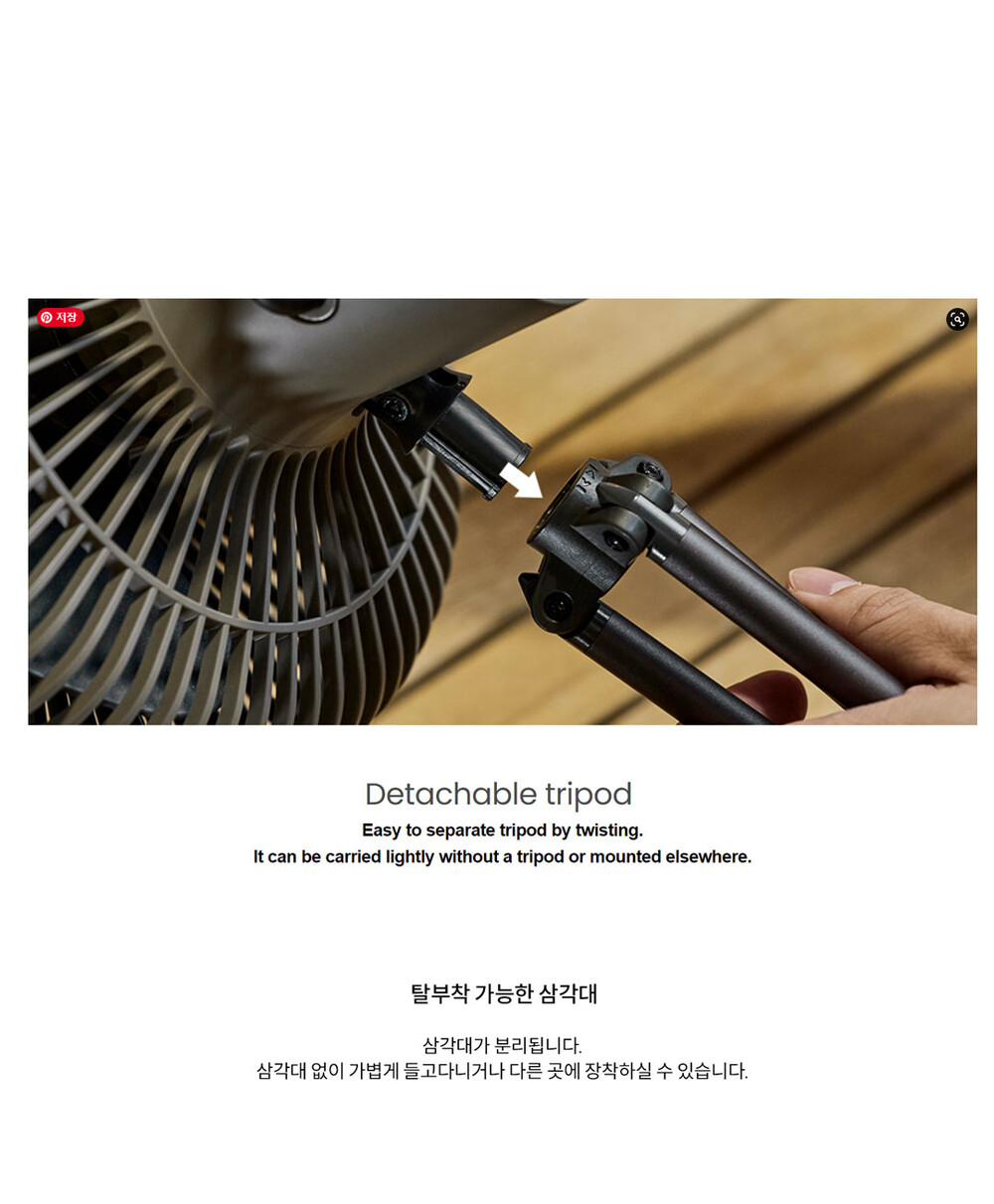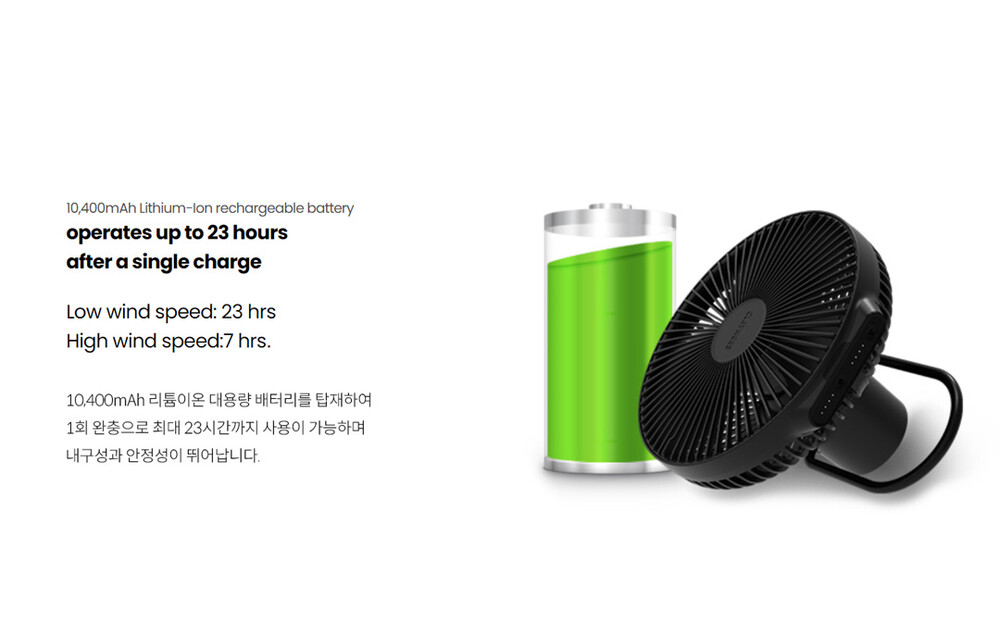 CLAYMORE의 V1040은 무선 선풍기으로서 야외 및 실내에서 냉/난방 서큘레이터로 활용하실 수 있습니다. 대용량 배터리인 리튬이온 10,400mAh로 1회 충전으로 최대 23시간 사용이 가능하며 풍속은 4단계로 조절이 가능합니다. 손잡이가 부착되어 휴대가 간편하고 리모컨으로 원격 조작할 수 있습니다.