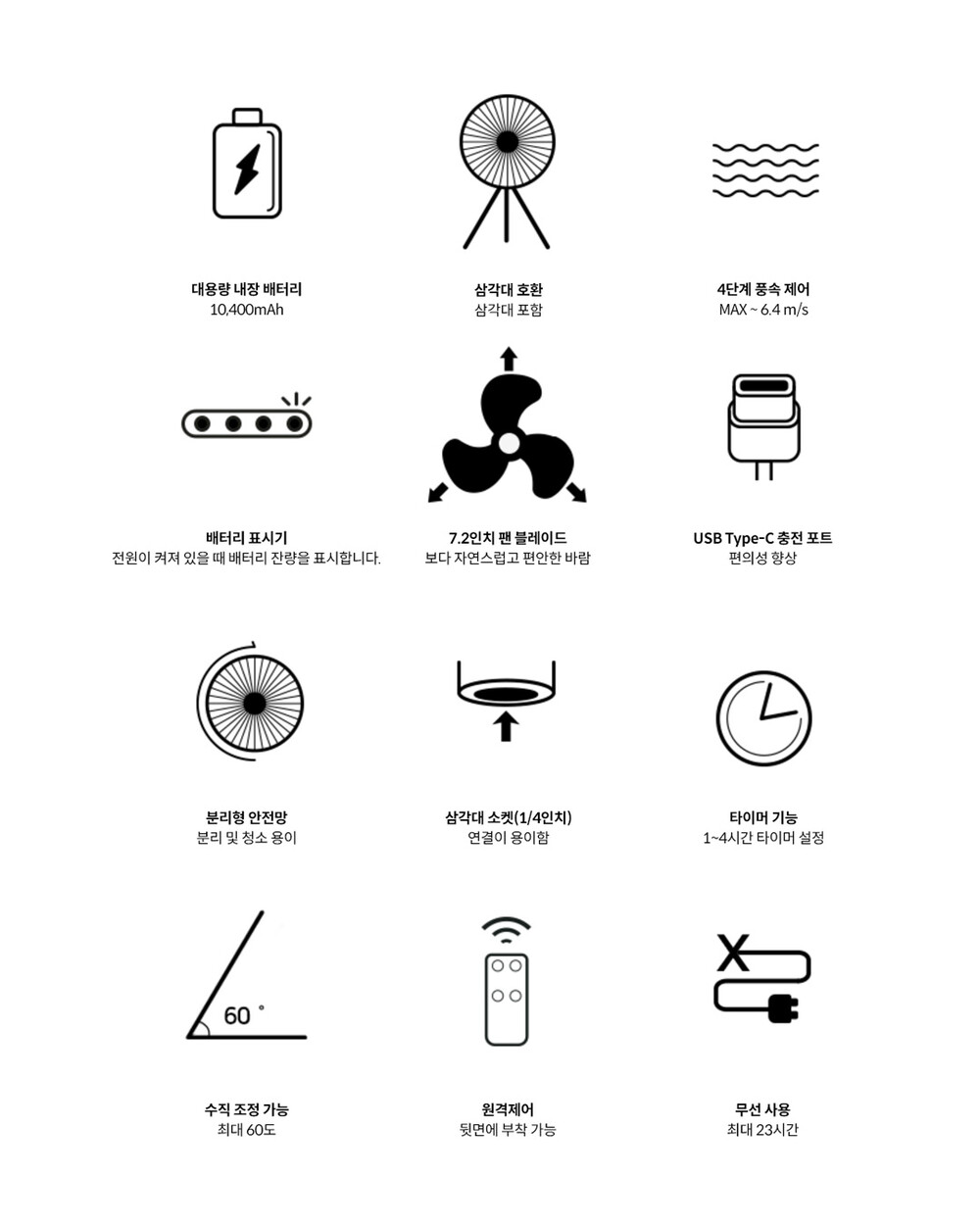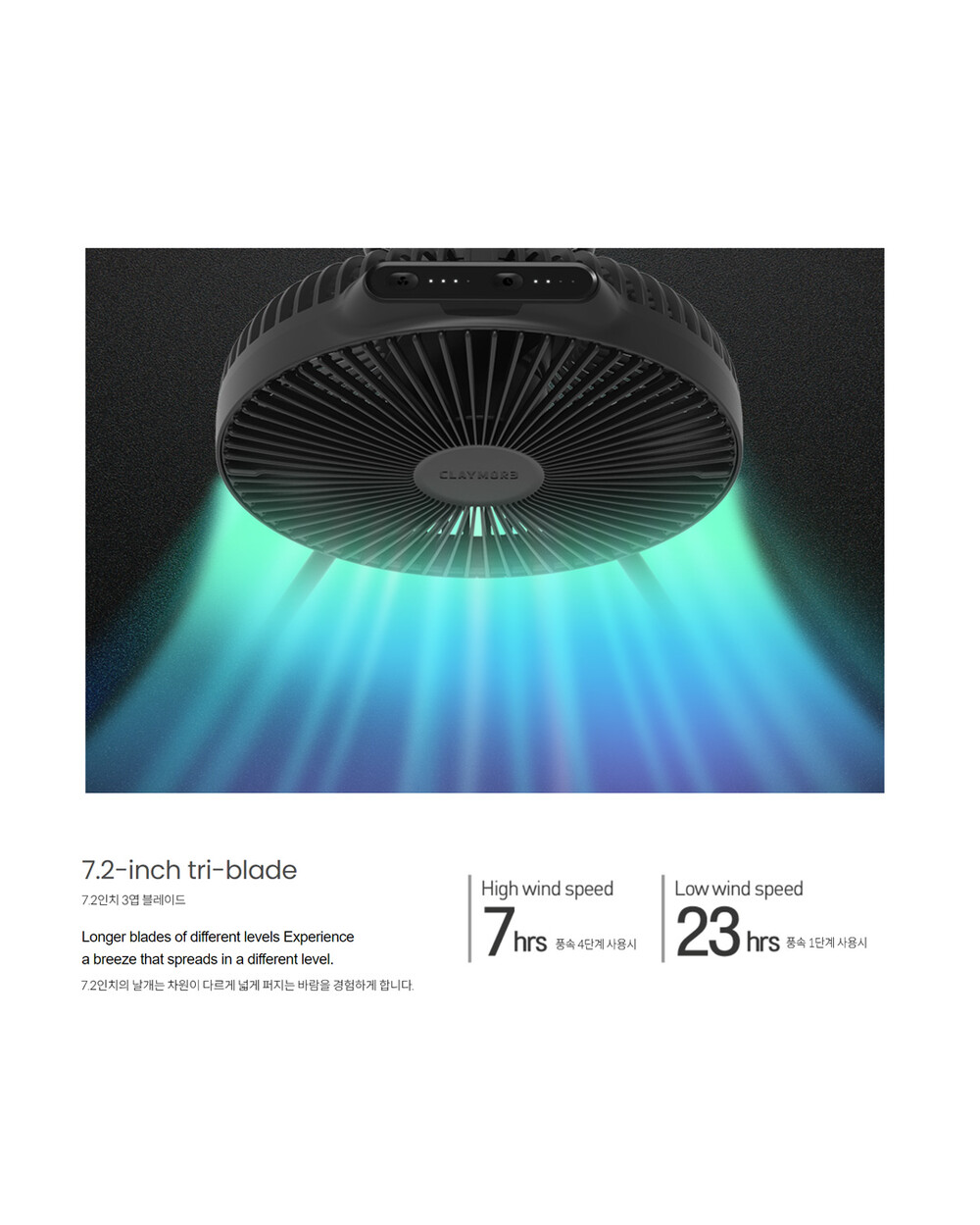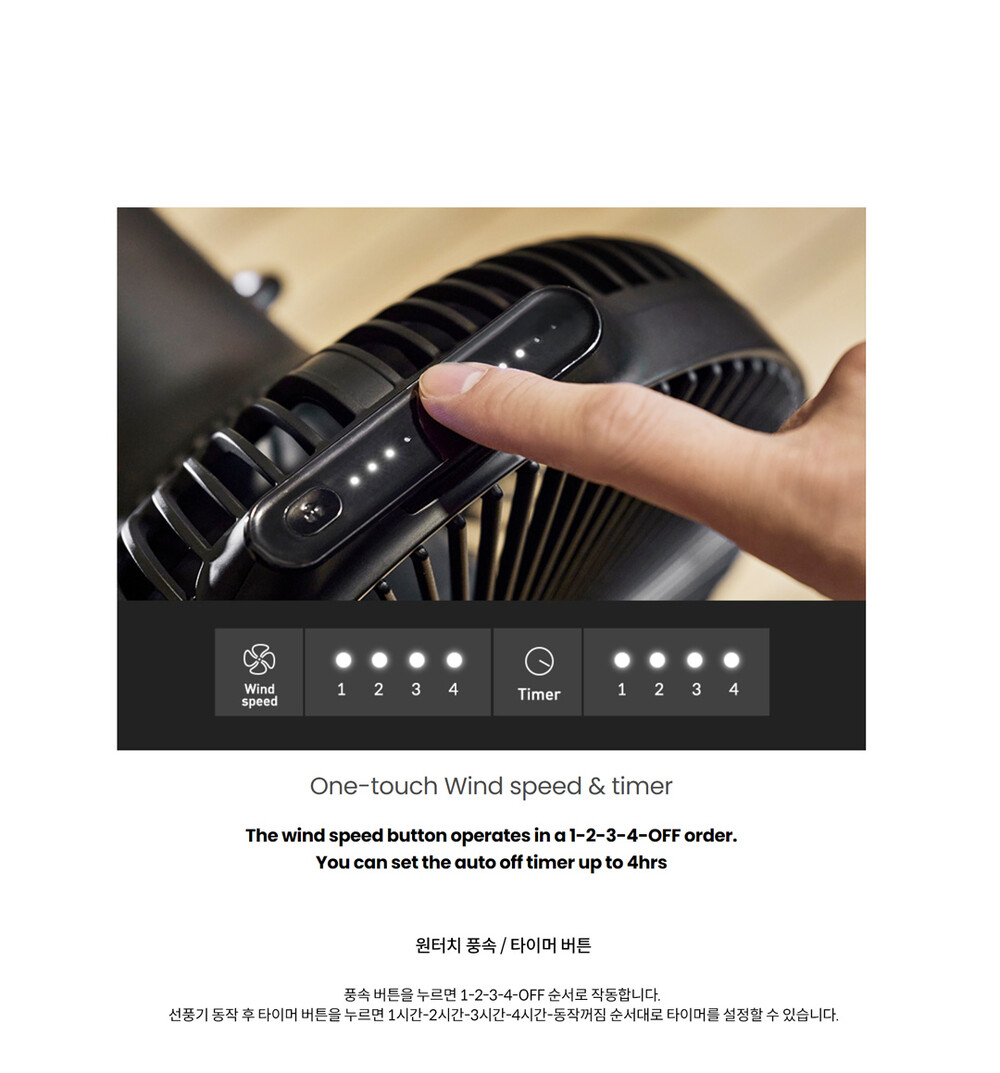 CLAYMORE의 V1040은 무선 선풍기으로서 야외 및 실내에서 냉/난방 서큘레이터로 활용하실 수 있습니다. 대용량 배터리인 리튬이온 10,400mAh로 1회 충전으로 최대 23시간 사용이 가능하며 풍속은 4단계로 조절이 가능합니다. 손잡이가 부착되어 휴대가 간편하고 리모컨으로 원격 조작할 수 있습니다.