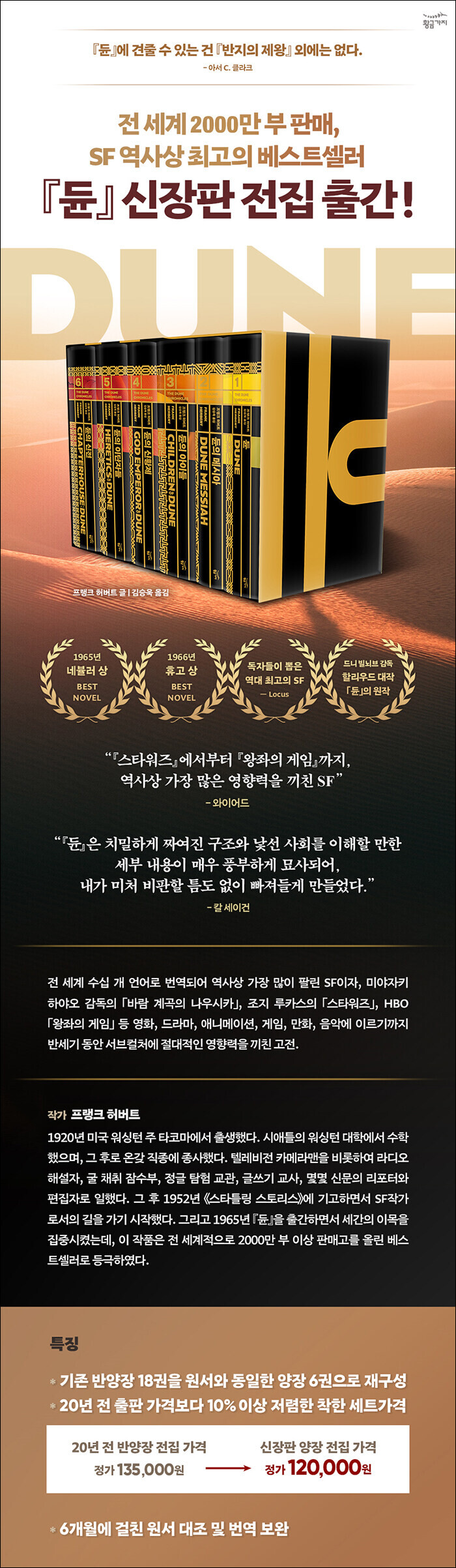 역사상 가장 많이 팔린 SF이자 독자들이 뽑은 역대 최고의 SF인 프랭크 허버트의 대작 『듄』이 신장판 전집으로 황금가지에서 출간되었다. 2001년 첫 번역본이 출간된 이후 20년 만에 재출간된 신장판은, 기존의 18권 반양장본을 원서와 동일한 6권으로 묶은 양장본으로서, 김승욱 역자가 6개월여의 원본 대조 작업을 통해 번역을 새롭게 손봤다.