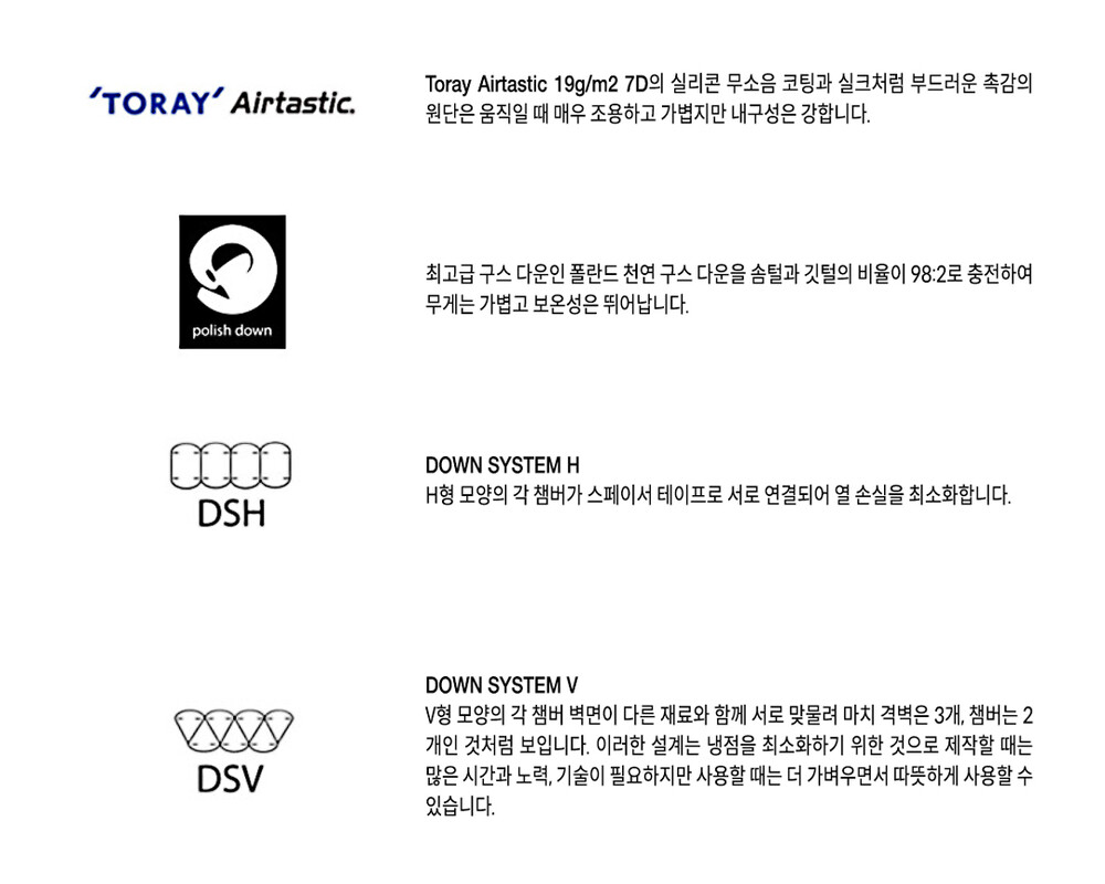 +상단은 냉점을 최소화한 V형 챔버 구조 (DSV), 후면은 열 손실을 최소화한 H형 챔버 구조 (DSH) 로 탁월한 다운의 분배