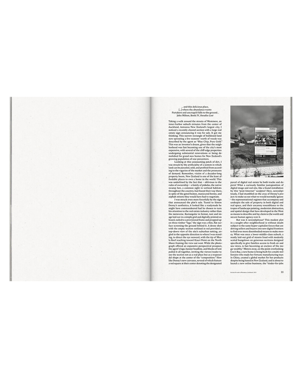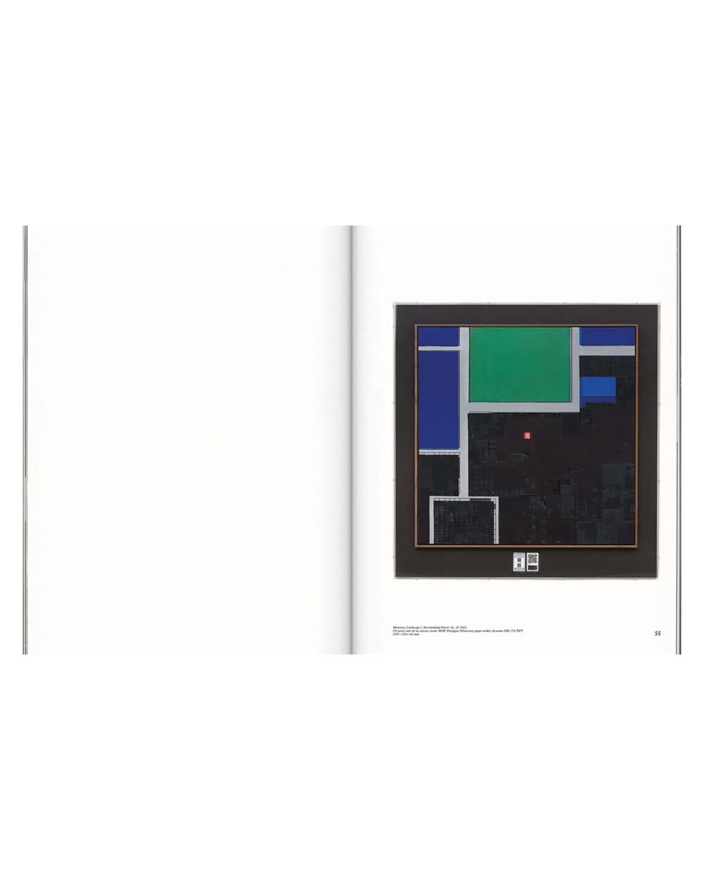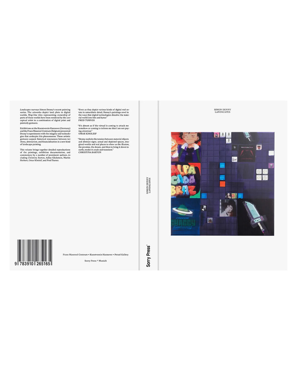 Simon Denny의 최근 페인팅 시리즈인 'Metaverse Landscapes' 는 디지털 월드 안의 토지 구획(land plots)을 묘사하며, 영토(territory), 추상화(abstraction), 그리고 금융화(financialization) 사이의 역사적 공명을 해체해 보여줍니다. 즉, 새로운 형태의 풍경화(landscape painting)를 통해, 디지털 부동산과 소유 개념이 오늘날 어떻게 시각화되는지를 파고듭니다.