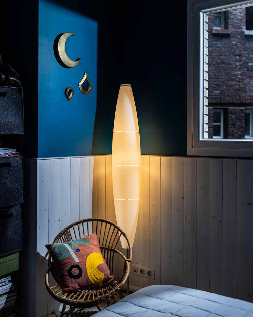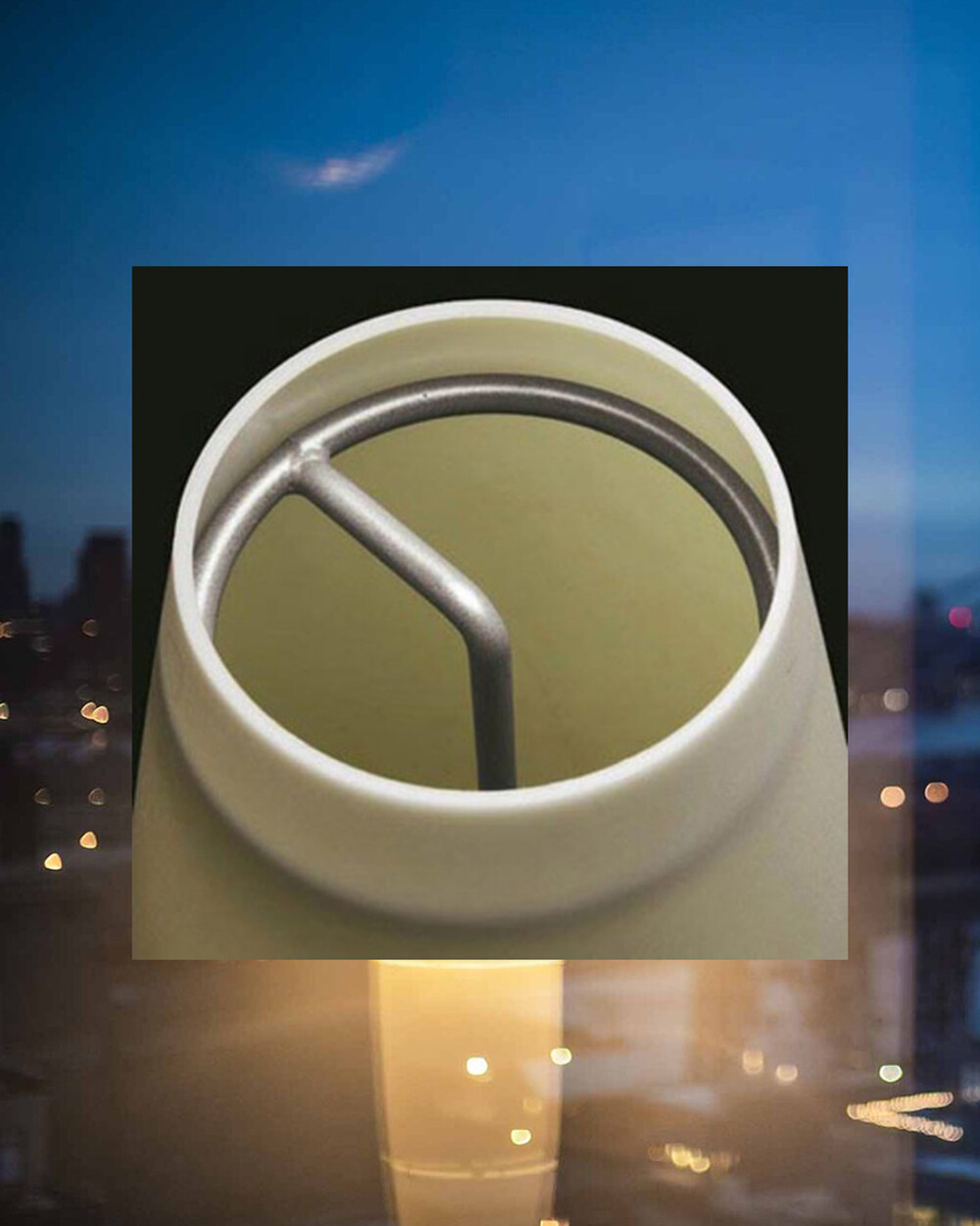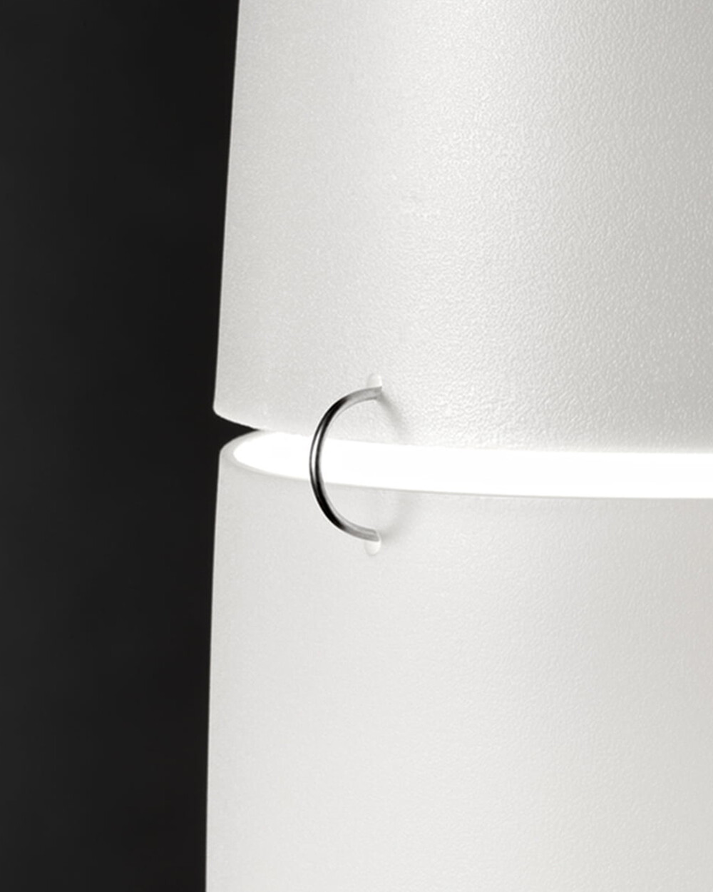 램프의 디퓨저는 흰색 톤의 폴리에틸렌 플라스틱으로 만들어져 따뜻한 빛을 사방으로 자연스럽게 발산합니다. 금속 고리로 연결된 네 개의 세그먼트로 나뉘어져있는데 그 사이에 가는 틈새가 빛 발산에 재미를 더합니다.