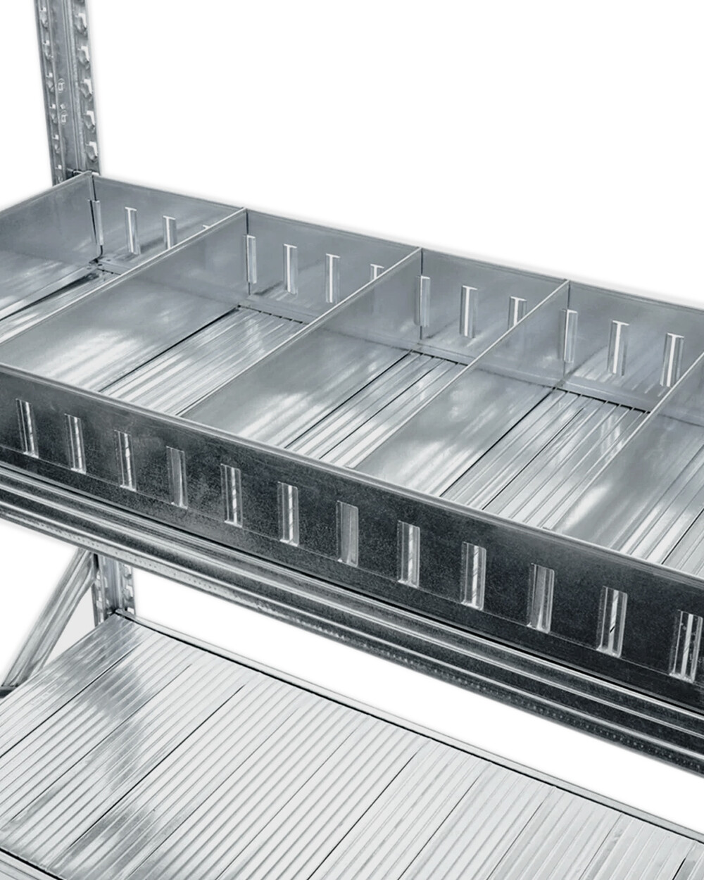 메탈시스템용 선반 트레이로서 칸막이를 5cm 간격으로 조정할 수 있어 수납이나, 잡화류의 정리·수납 등 용도에 맞추어 자유자재로 활용할 수 있습니다.