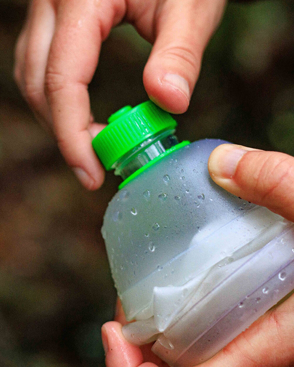 크녹아웃도어의 베시카 Vesica® 1L 물병은 비었을 땐 납작하게 접어 넣고, 채웠을 땐 하드 보틀처럼 단단하게 들고 마실 수 있는 콜랩서블(접이식) 물병입니다. 바디는 유연하지만 넥과 바닥은 단단하여 자립이 가능하며 28mm 범용 나사산을 사용해 Sawyer·HydroBlu 등 휴대용 정수 필터에 바로 체결됩니다.