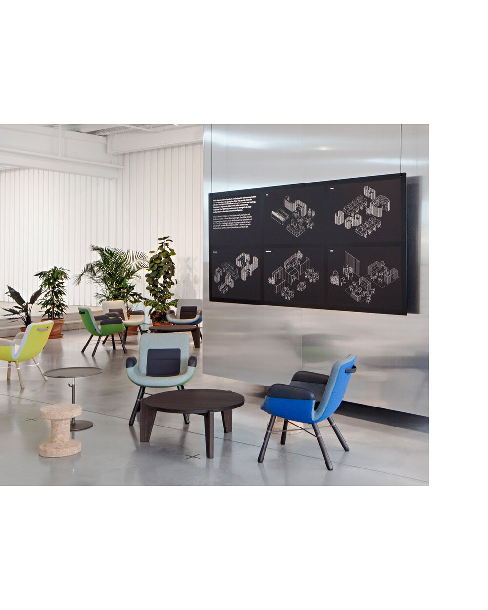 바쁜 환경에서 무거운 가구가 비생산적이라고 확신하는 헬라 용에리위스는 '즉흥적인 회의를 위한 중립적인 공간으로 주로 사용되는 라운지에서 가구는 활기찬 분위기를 만드는 데 중요한 역할을 합니다.'라고 말합니다. 캐주얼한 분위기에서 대화를 원활하게 하기 위한 가장 중요한 요소는 새로운 종류의 안락의자입니다. 견고하면서도 가볍고 이동성이 뛰어난 안락의자가 바로 그녀가 원하는 것이었습니다.